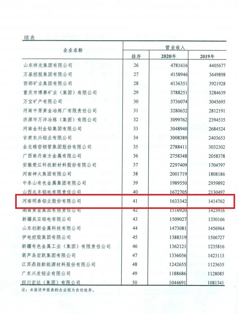 8月3日,中國有色金屬工業協會召開新聞發布會,發布2020年有色金屬工業企業營業收入50強名單。明泰鋁業以163.3億元的營業收入,榮登“2020年有色金屬工業企業營業收入50強”,排名第41位。
